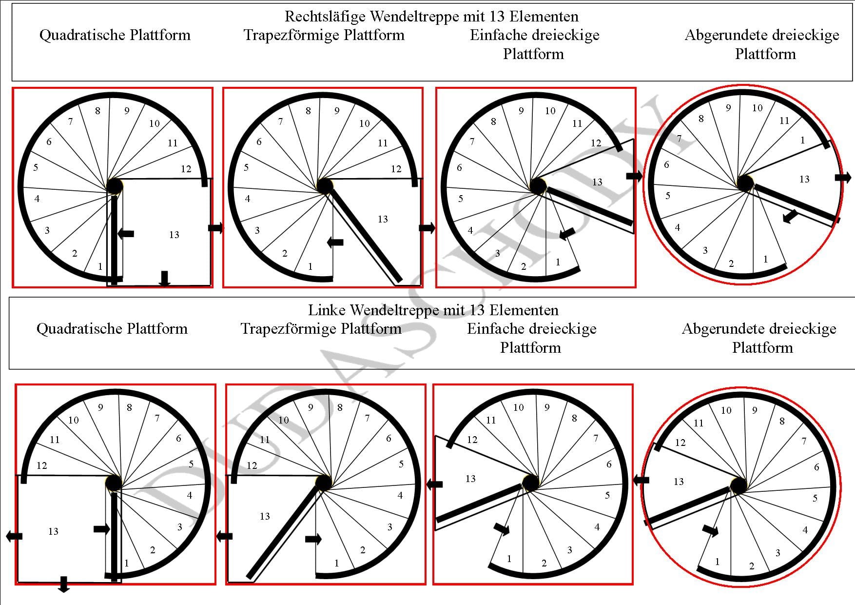 Die angebotenen Wendeltreppen passen in zwei Arten von Öffnungen in der Decke und haben abhängig davon unterschiedliche Podeste. Dreieckige Podeste passen in runde Öffnungen. Dreieckige und trapezförmige Plattformen sind auf quadratische Öffnungen abgestimmt. Die Treppe in diesem Modell hat eine rechte und linke Behandlung. Je nach Konzept sind sie universell montierbar.