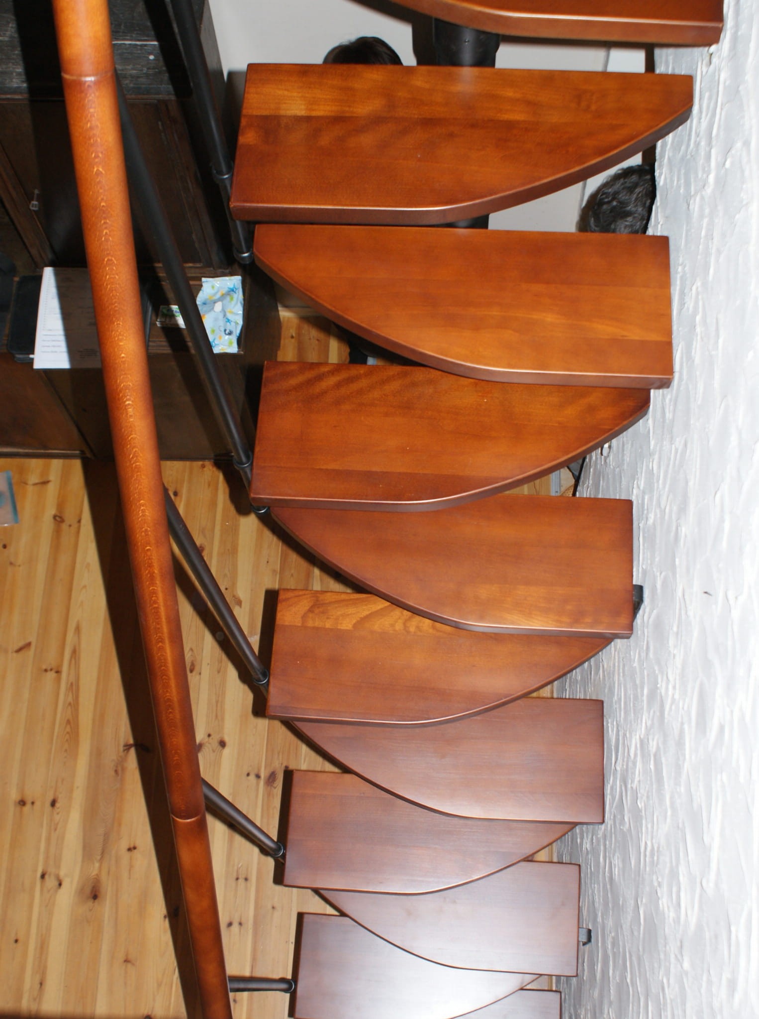 Das Set enthält 12 Treppenelemente, die in 13 Ebenen gefaltet sind. Die Elemente bestehen überwiegend aus Massivholz (Farbe nach Wahl aus der Farbpalette des Herstellers) und pulverbeschichtetem Stahl in Schwarz-Matt-Struktur. Nach Bestellung des kostenpflichtigen Service erfolgt die fachgerechte Installation im Land durch den Hersteller.