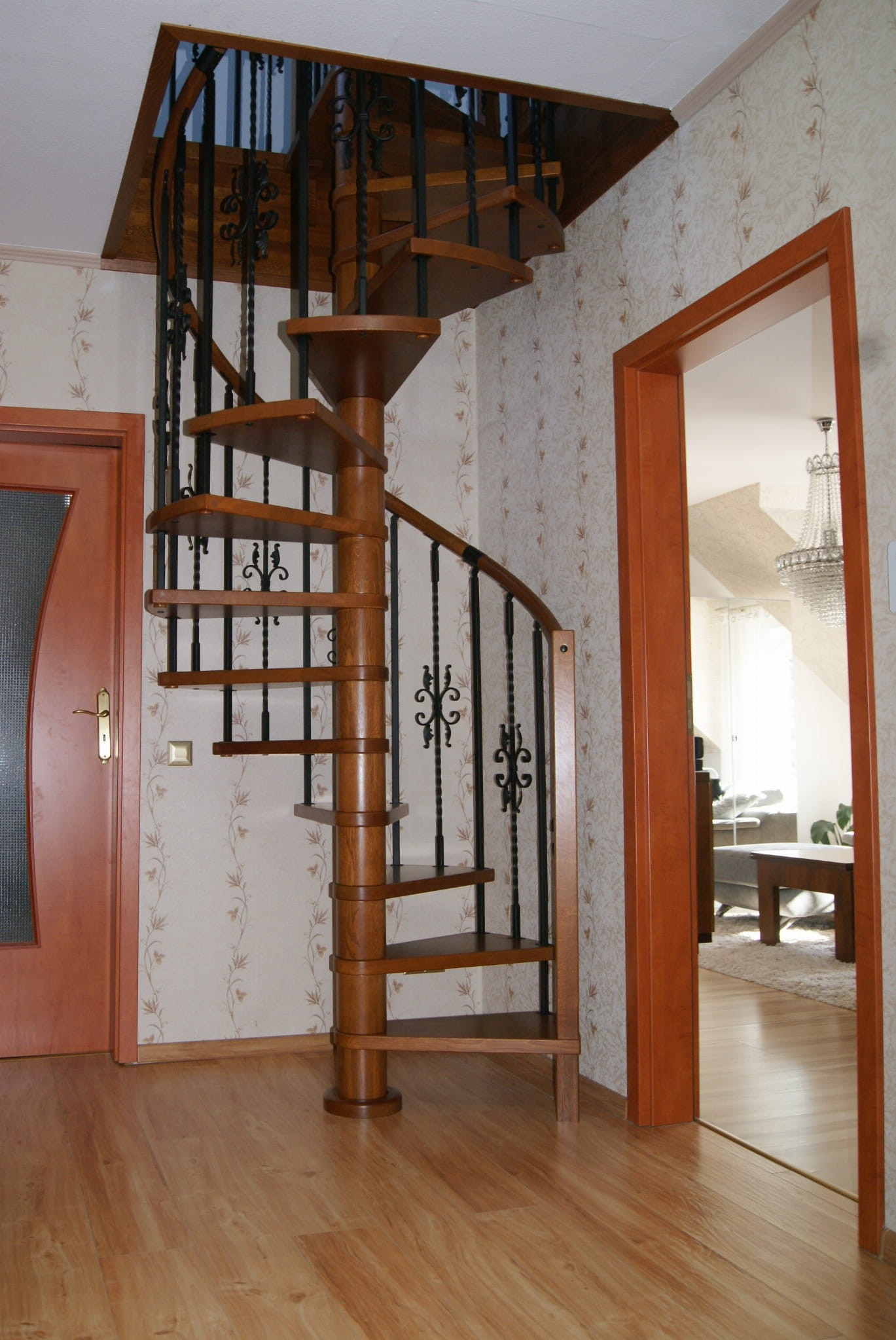 Eine Wendeltreppe, angepasst an den Durchmesser der Deckenöffnung von 170 cm. Die Elemente bestehen aus Massivholz (Farbe zur Auswahl aus der Farbpalette des Herstellers) und pulverbeschichtetem Stahl in Schwarz-Matt-Struktur. Sie können sie selbst zusammenbauen, der Hersteller bietet jedoch gegen Aufpreis auch einen Montageservice an.