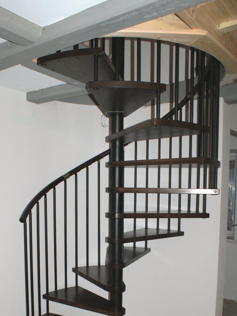 Eine Reihe von Wendeltreppen, die an den Durchmesser der Deckenöffnung von 160 cm angepasst sind. Die Elemente bestehen aus Massivholz (Farbe nach Wahl aus der Farbpalette des Herstellers) und pulverbeschichtetem Stahl in Schwarz-Matt-Struktur. Sie können sie selbst montieren, der Hersteller bietet aber auch einen Montageservice gegen Aufpreis an.