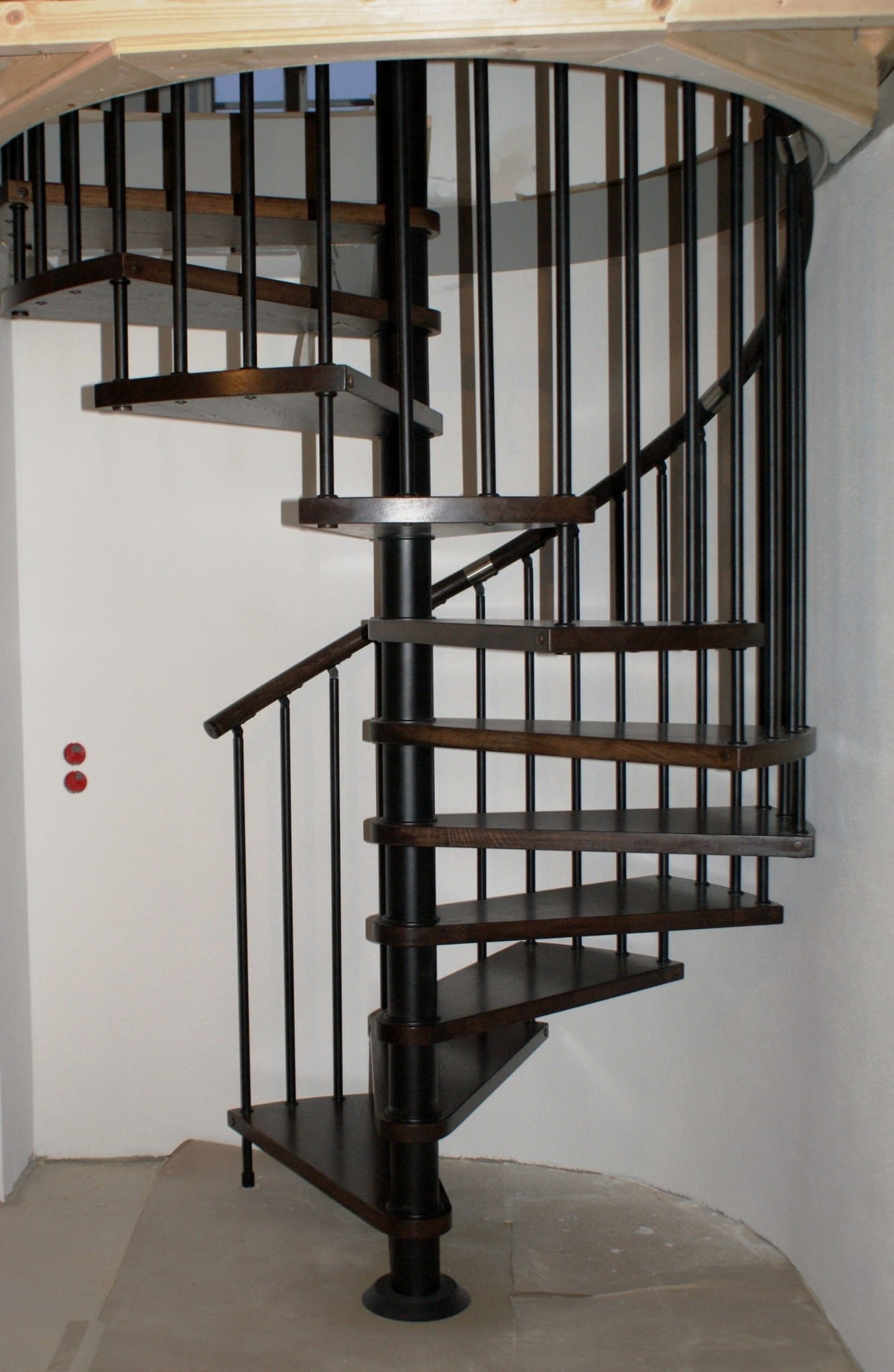 Eine Reihe von Wendeltreppen, die an den Durchmesser der Deckenöffnung von 200 cm angepasst sind. Die Elemente bestehen aus Massivholz (Farbe nach Wahl aus der Farbpalette des Herstellers) und pulverbeschichtetem Stahl in Schwarz-Matt-Struktur. Sie können sie selbst montieren, der Hersteller bietet aber auch einen Montageservice gegen Aufpreis an.