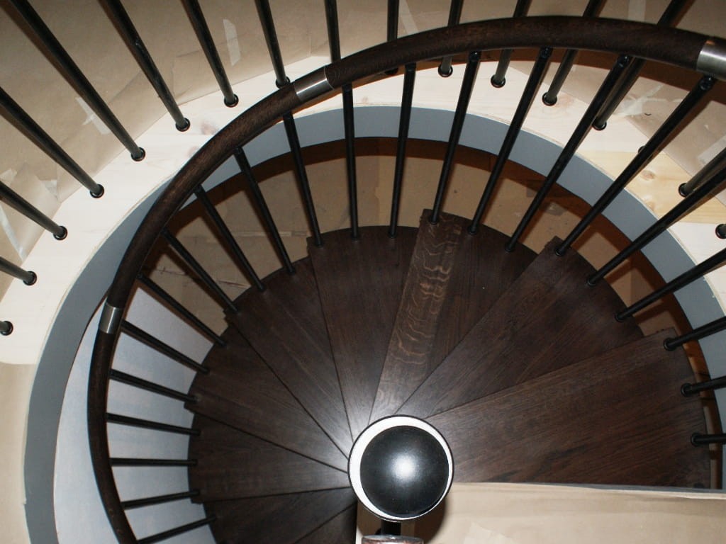 Eine Reihe von Wendeltreppen, die an den Durchmesser der Deckenöffnung von 210 cm angepasst sind. Die Elemente bestehen aus Massivholz (Farbe nach Wahl aus der Farbpalette des Herstellers) und pulverbeschichtetem Stahl in Schwarz-Matt-Struktur. Sie können sie selbst montieren, der Hersteller bietet aber auch einen Montageservice gegen Aufpreis an.