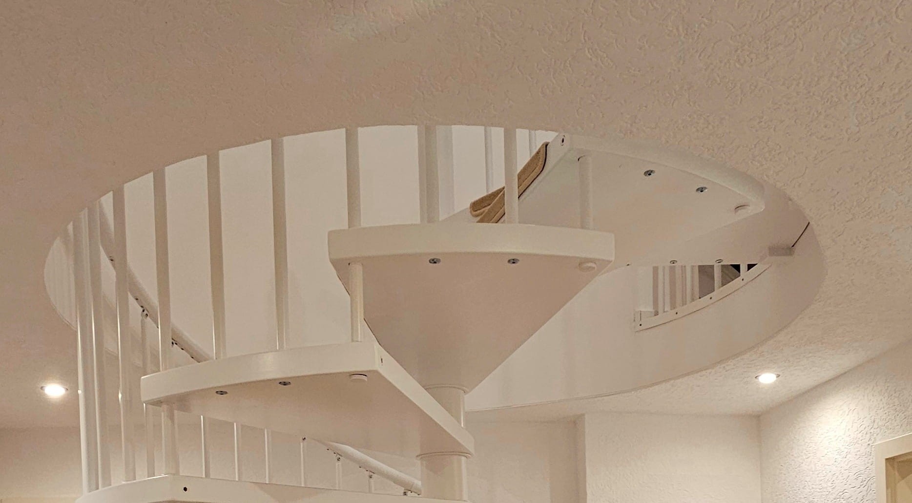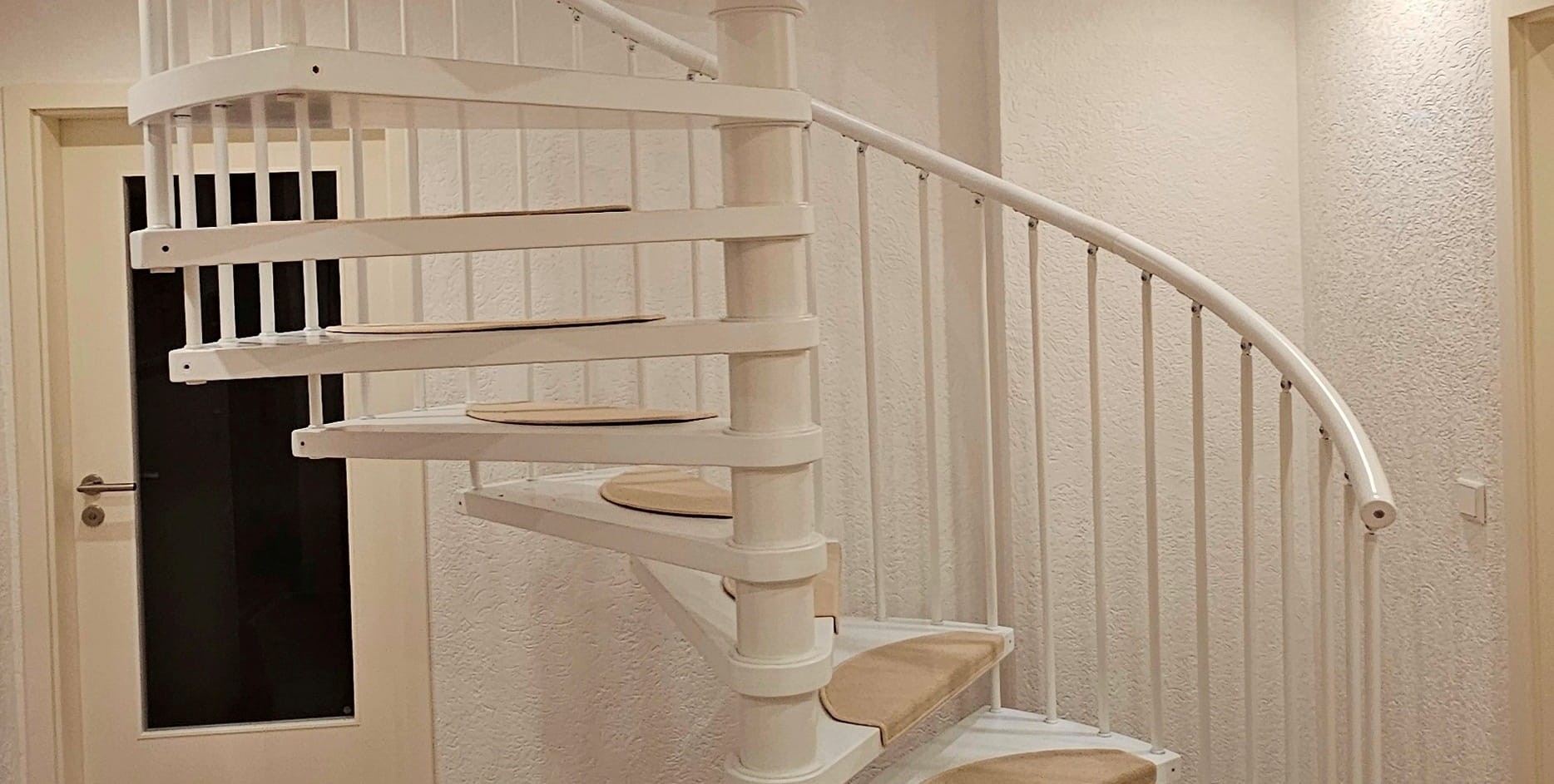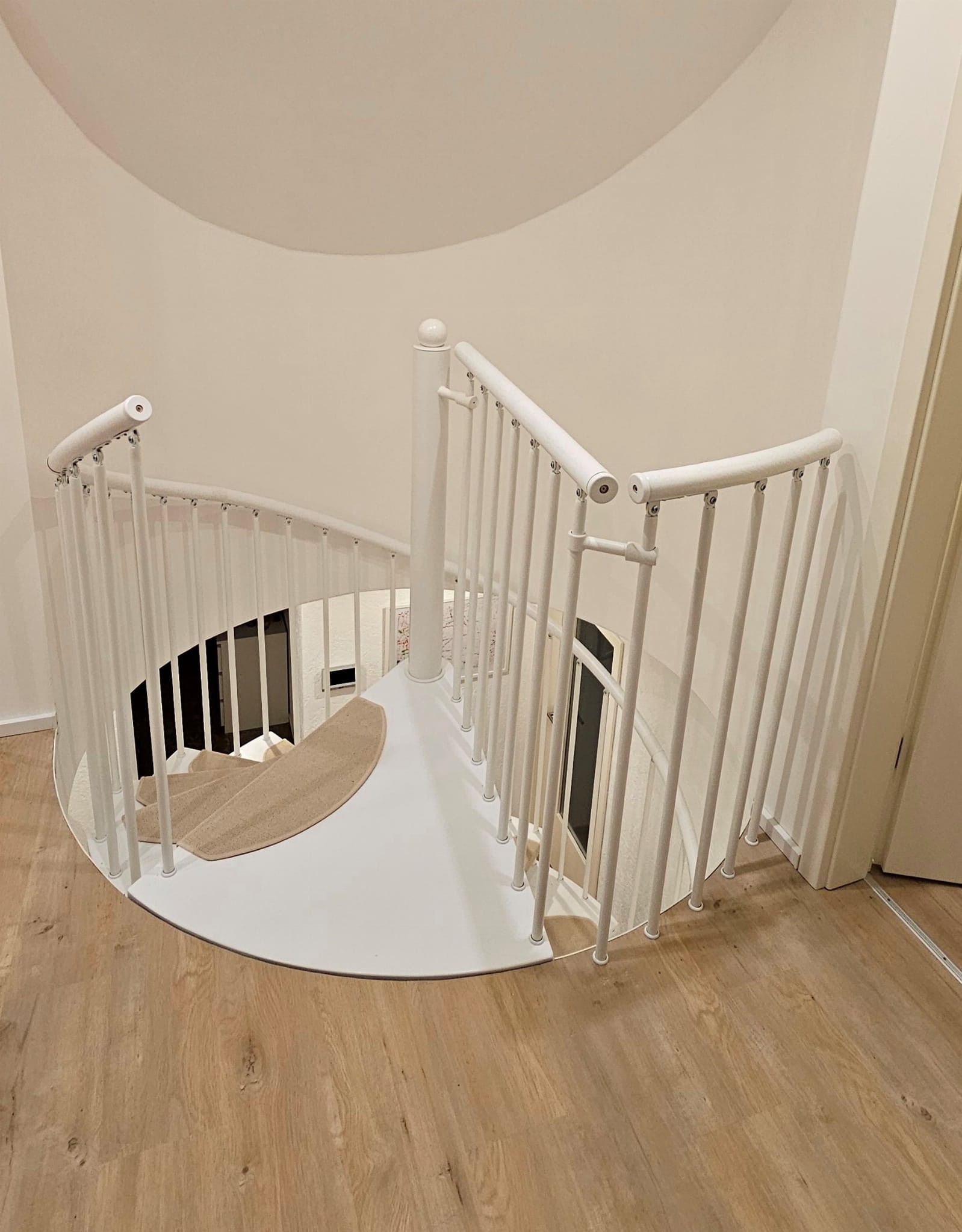 Eine Reihe von Wendeltreppen, die an den Durchmesser der Deckenöffnung von 190 cm angepasst sind. Die Elemente bestehen aus Massivholz (Farbe nach Wahl aus der Farbpalette des Herstellers) und pulverbeschichtetem Stahl in mattweißer Struktur. Sie können sie selbst montieren, der Hersteller bietet aber auch einen Montageservice gegen Aufpreis an.
