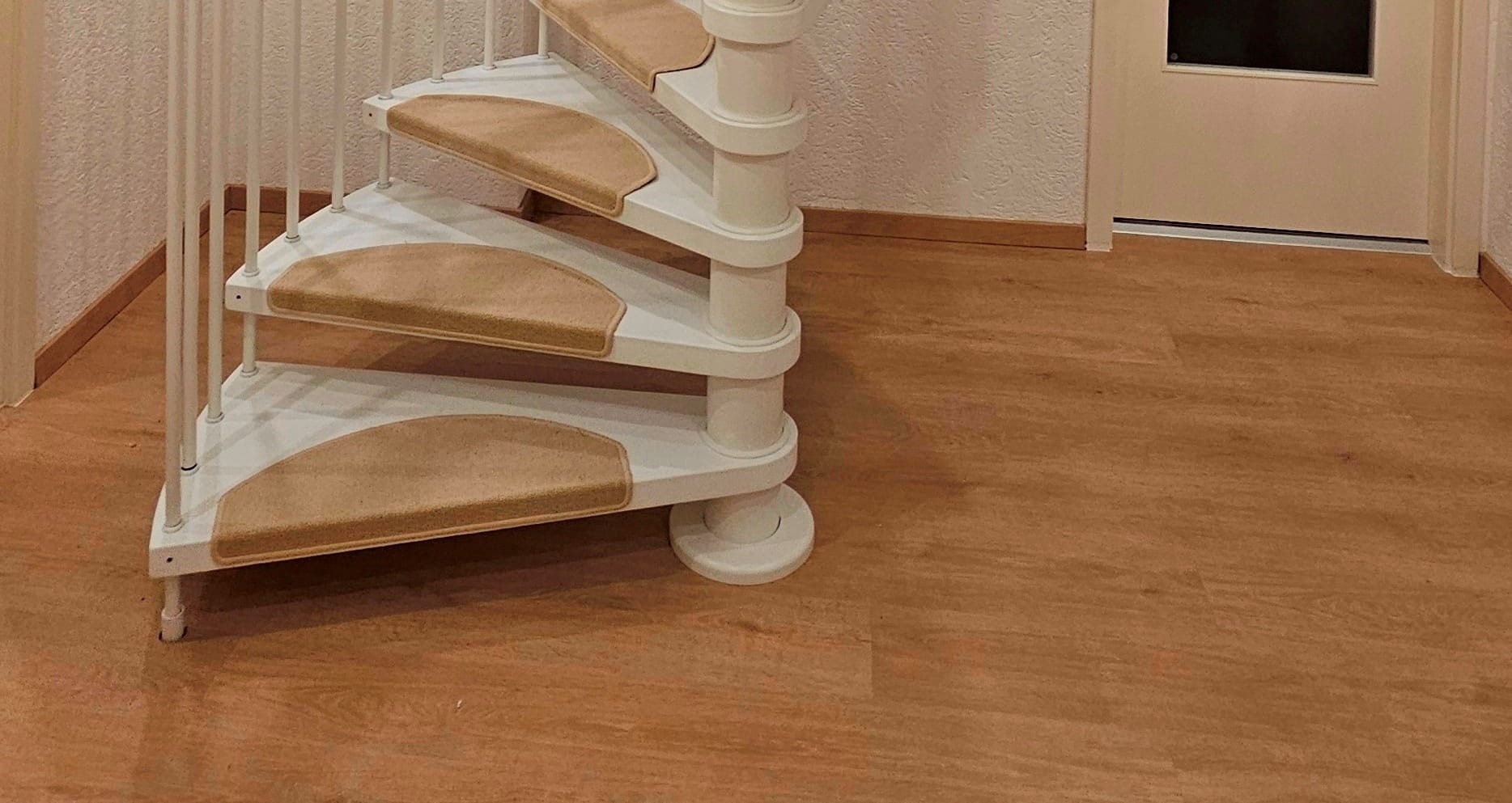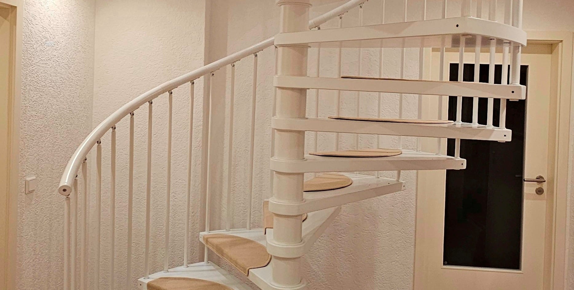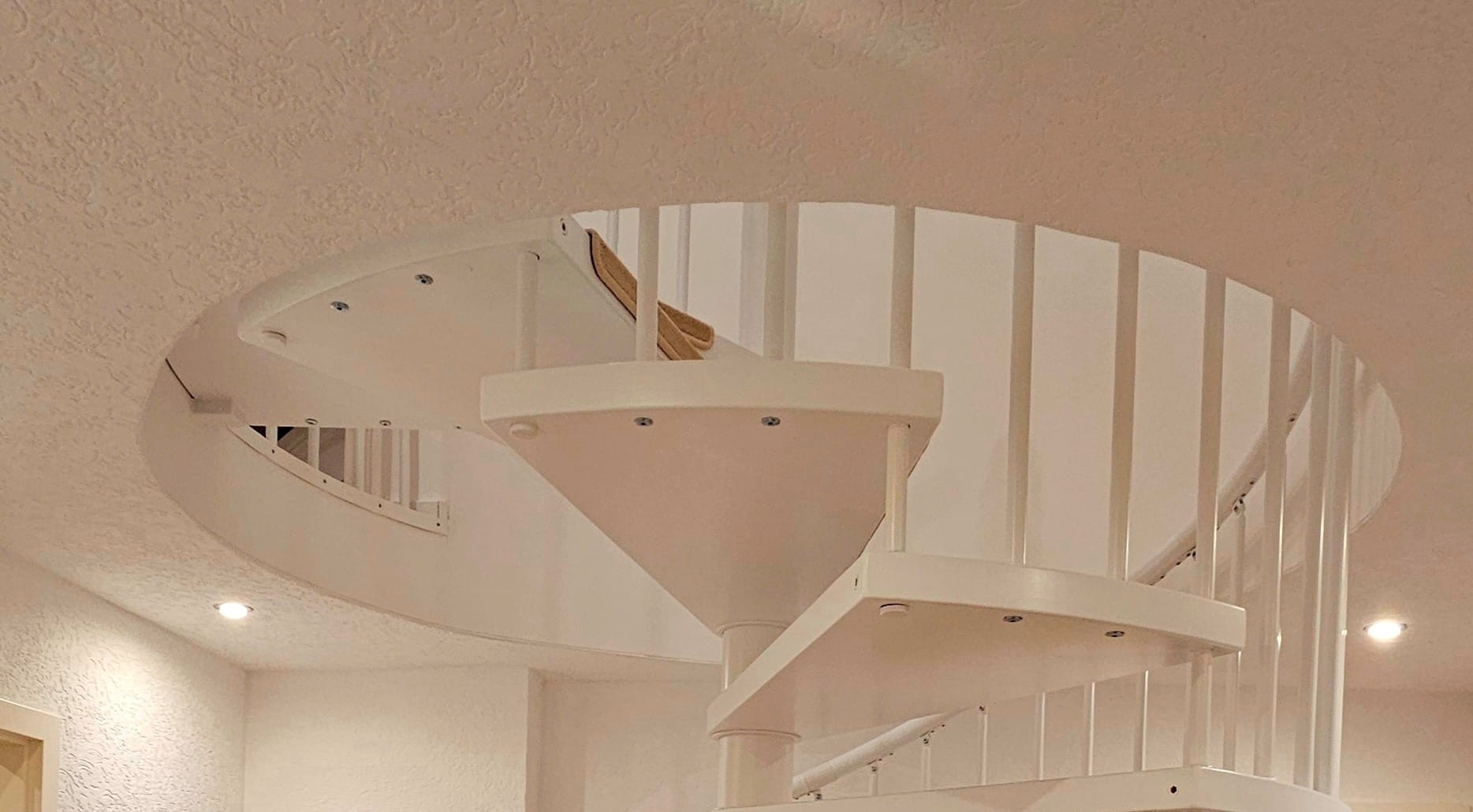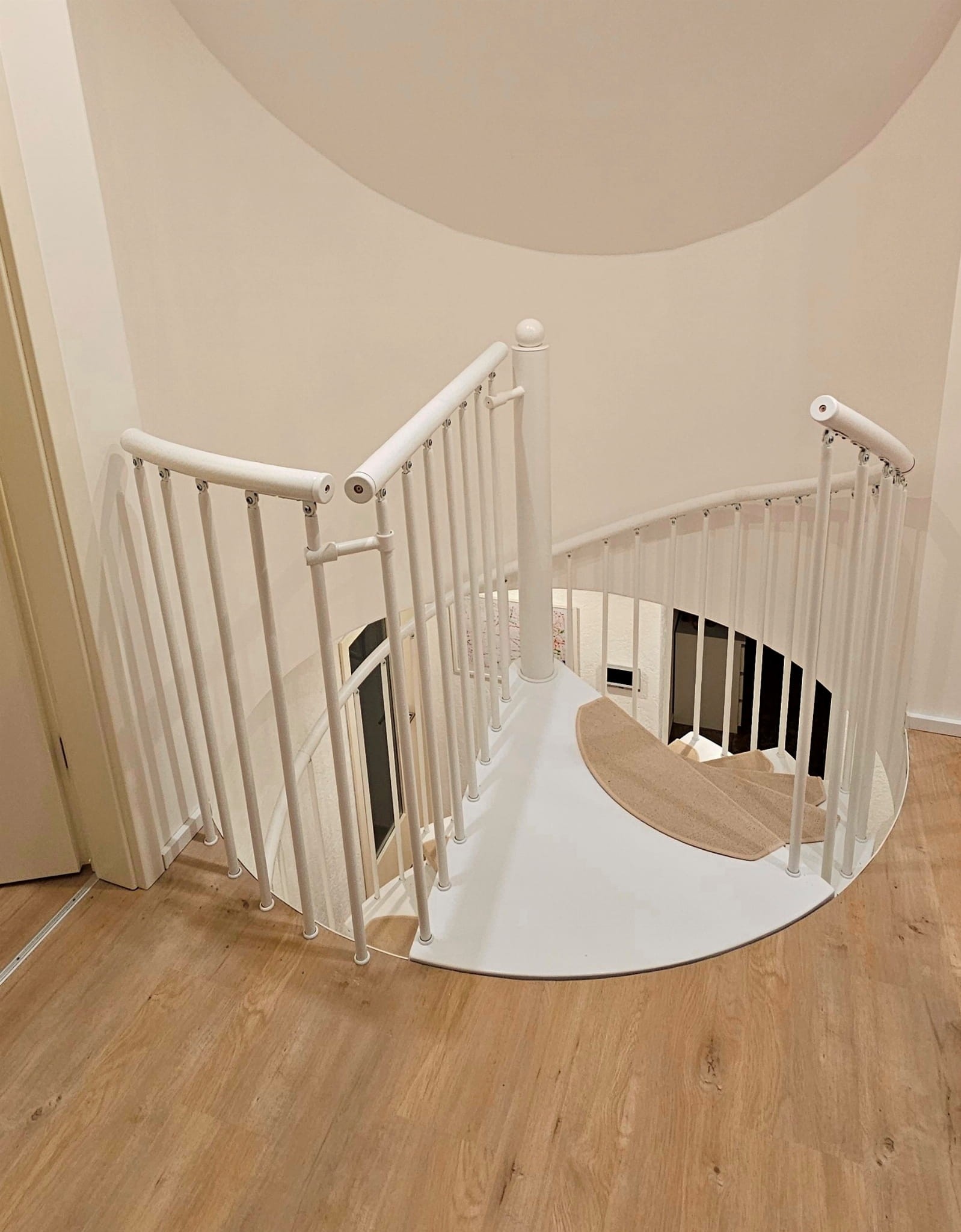 Eine Reihe von Wendeltreppen, die an den Durchmesser der Deckenöffnung von 200 cm angepasst sind. Die Elemente bestehen aus Massivholz (Farbe nach Wahl aus der Farbpalette des Herstellers) und pulverbeschichtetem Stahl in mattweißer Struktur. Sie können sie selbst montieren, der Hersteller bietet aber auch einen Montageservice gegen Aufpreis an.