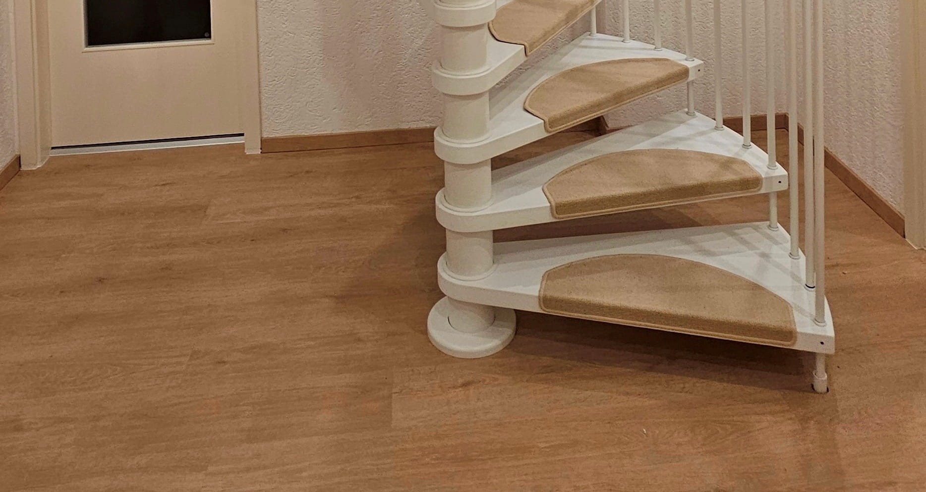 Eine Reihe von Wendeltreppen, die an den Durchmesser der Deckenöffnung von 210 cm angepasst sind. Die Elemente bestehen aus Massivholz (Farbe nach Wahl aus der Farbpalette des Herstellers) und pulverbeschichtetem Stahl in mattweißer Struktur. Sie können sie selbst montieren, der Hersteller bietet aber auch einen Montageservice gegen Aufpreis an.