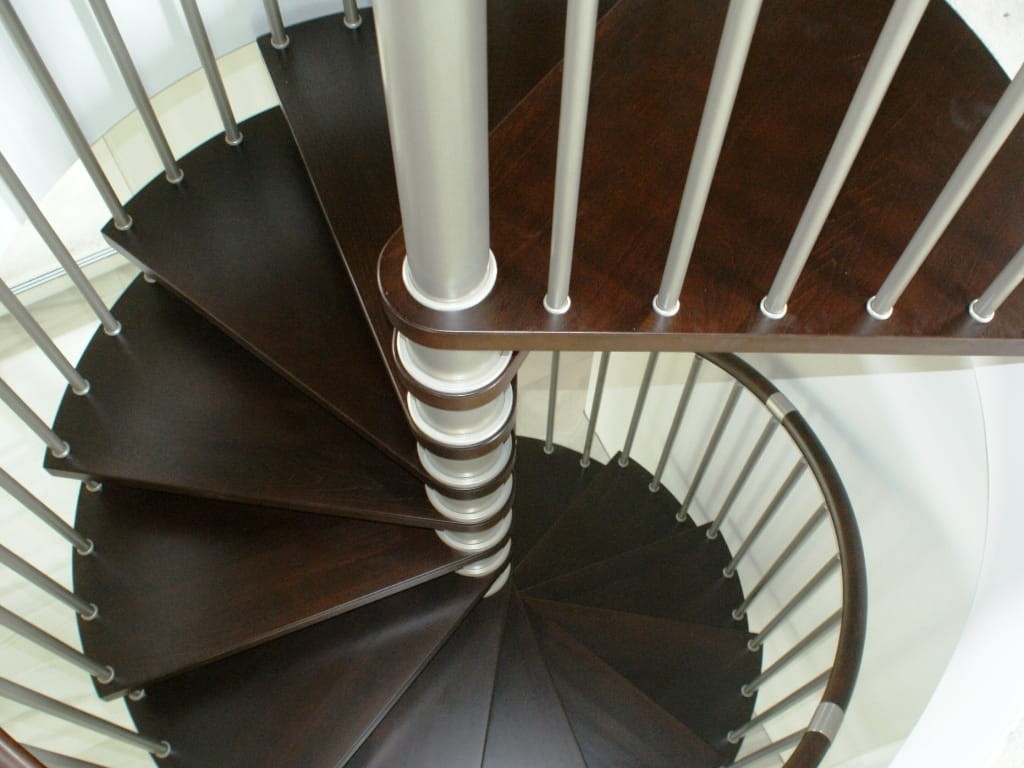 Eine Reihe von Wendeltreppen, die an den Durchmesser der Deckenöffnung von 160 cm angepasst sind. Die Elemente bestehen aus Massivholz (Farbe nach Wahl aus der Farbpalette des Herstellers) und pulverbeschichtetem Stahl in Satin Steel. Sie können sie selbst montieren, der Hersteller bietet aber auch einen Montageservice gegen Aufpreis an.