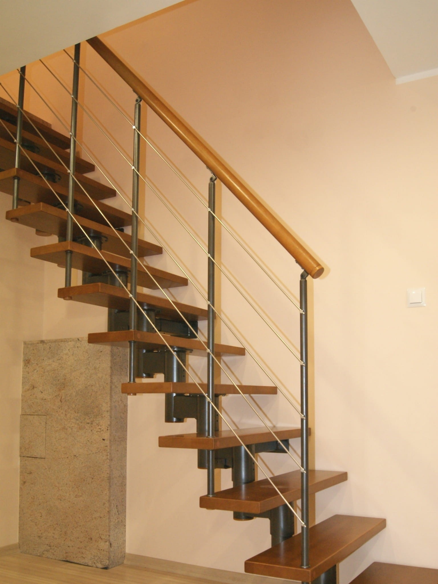 Die Treppe sollte teilweise an der Wand entlanglaufen. Sie dürfen nicht weiter als 5 cm von der Wand entfernt werden. Dies hängt mit der Sicherheit der Treppenbenutzung zusammen. Es ist notwendig, einen Wandanker zu verwenden.