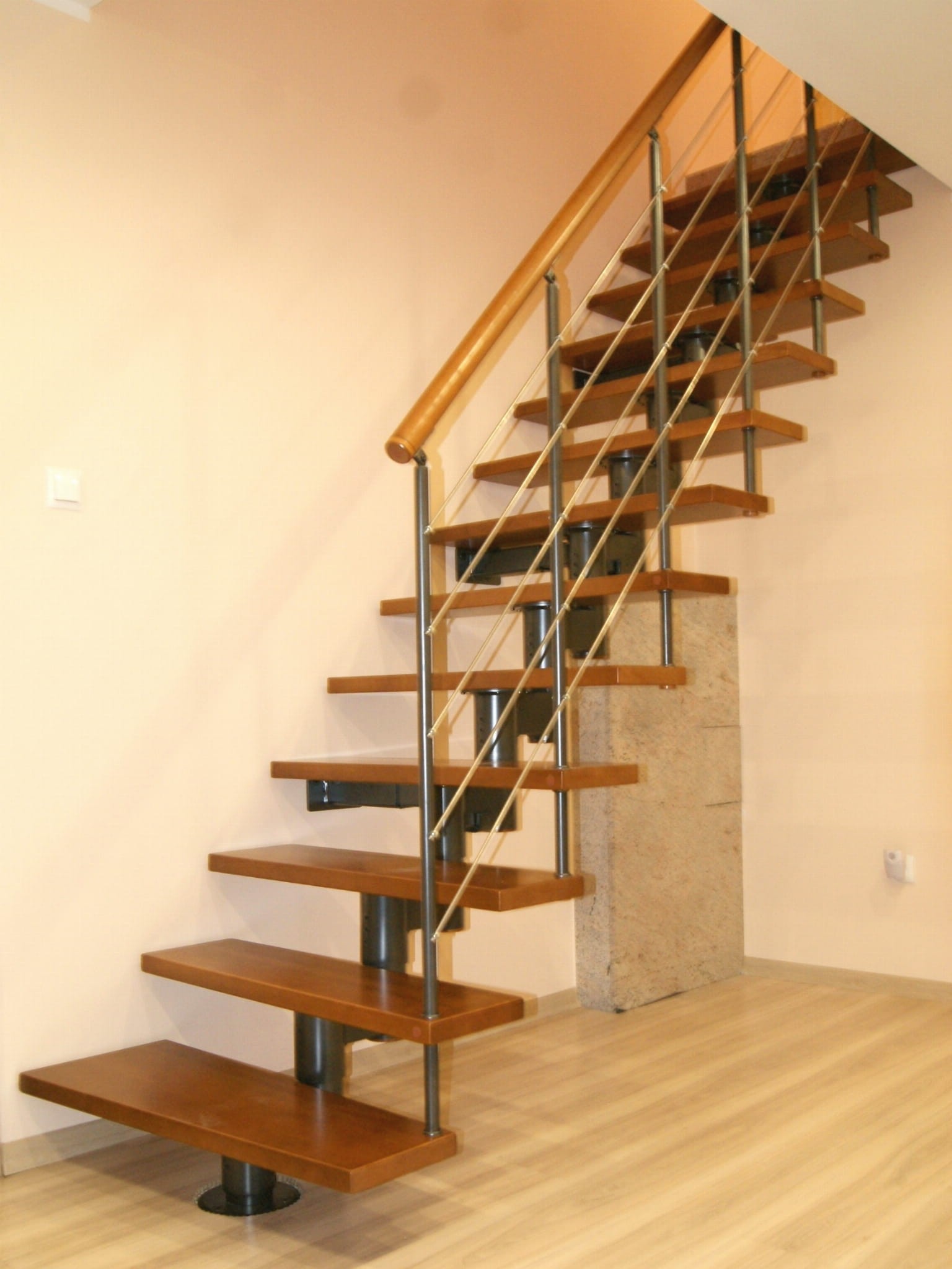 Die Treppe sollte teilweise an der Wand entlanglaufen. Sie dürfen nicht weiter als 5 cm von der Wand entfernt werden. Dies hängt mit der Sicherheit der Treppenbenutzung zusammen. Es ist notwendig, einen Wandanker zu verwenden.