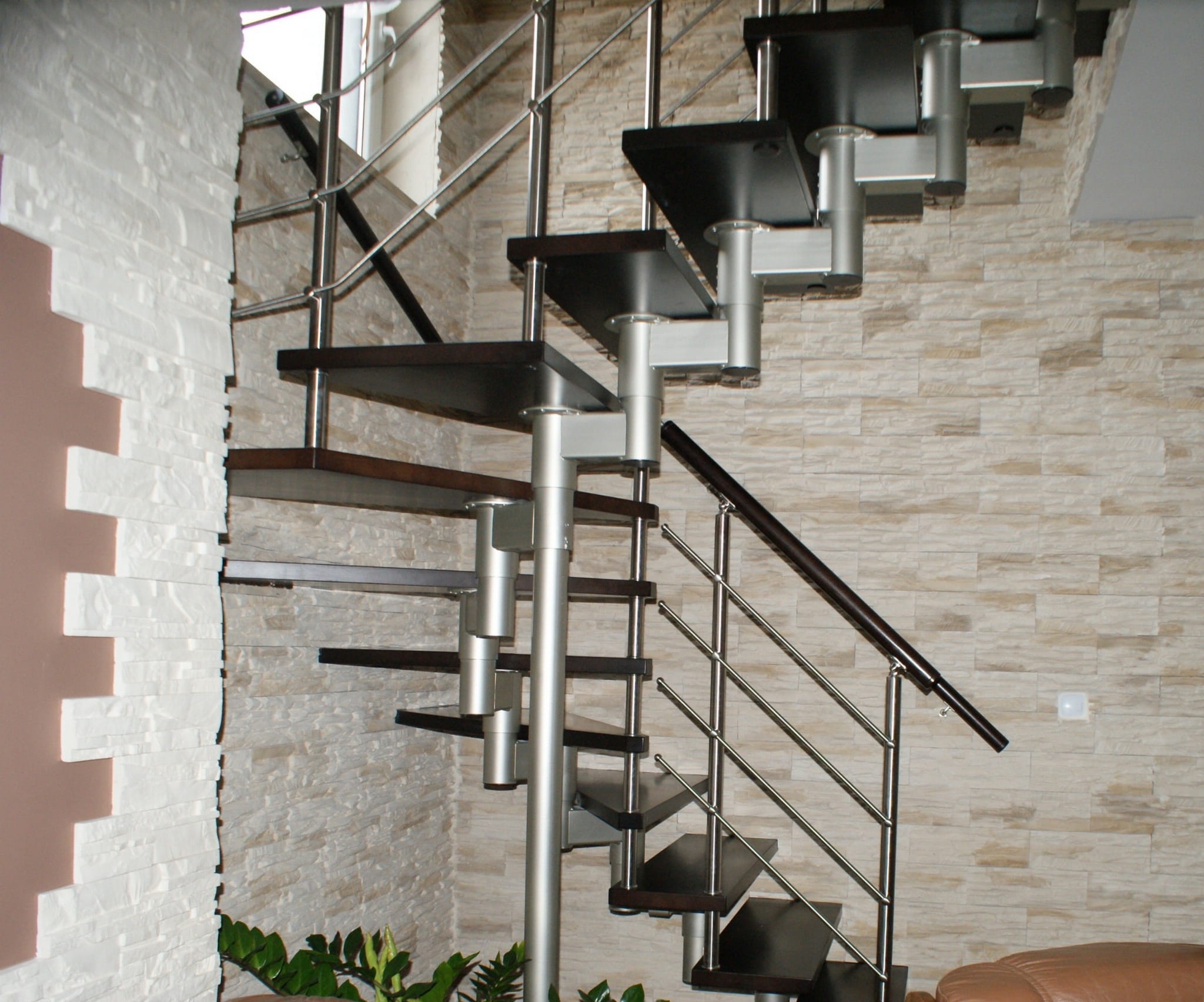Es wird empfohlen, die Treppe bis zu 5 cm von der Wand entfernt zu installieren, was die Installation von Ankern ermöglicht. Wenn die Wand der Verankerung nicht standhält, sollte stattdessen eine Stützsäule verwendet werden. Bei freistehenden Treppen ist der Einsatz einer Stützsäule sowie eines beidseitigen Sicherheitsgeländers vorgesehen, weitere Optionen auf Anfrage.