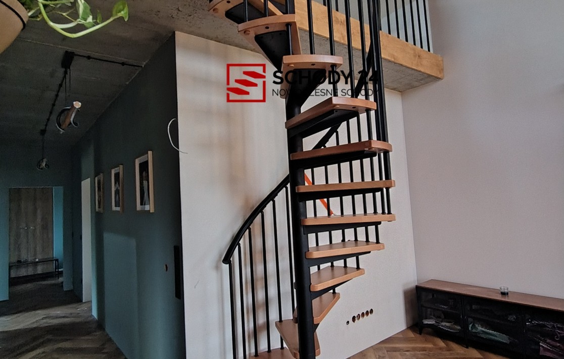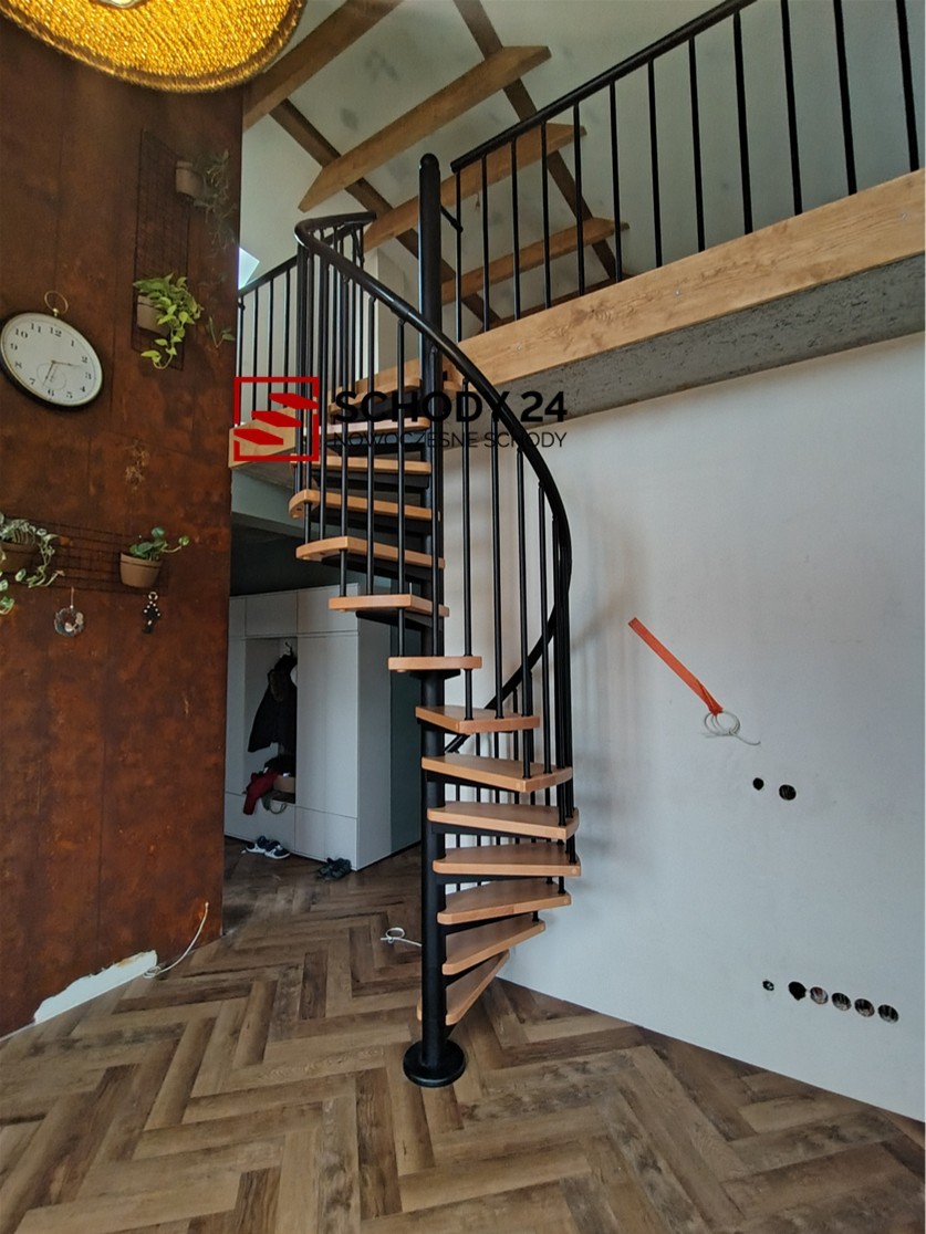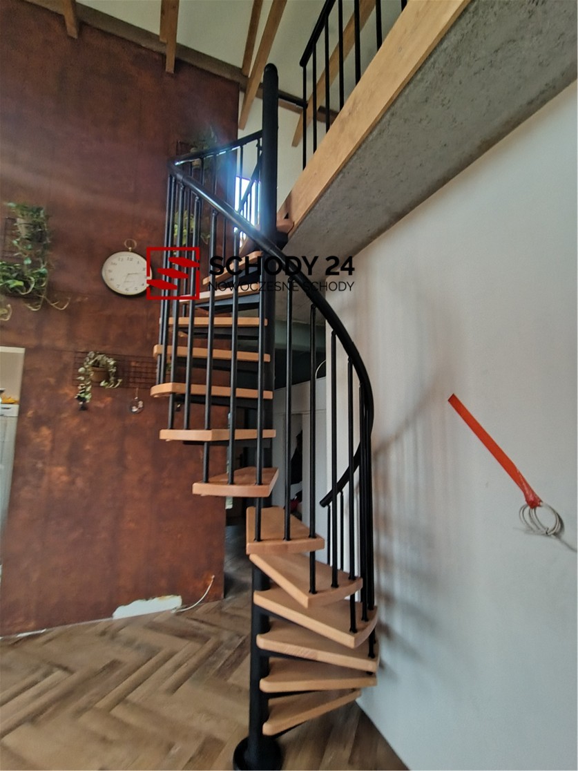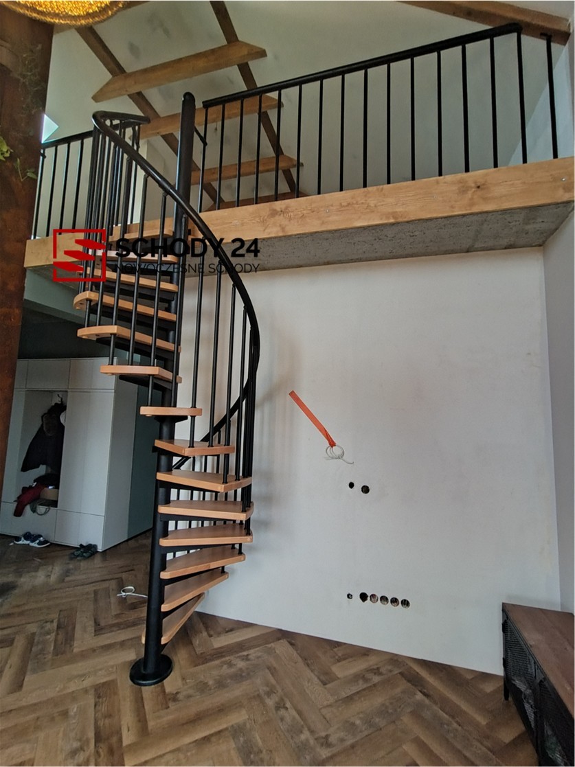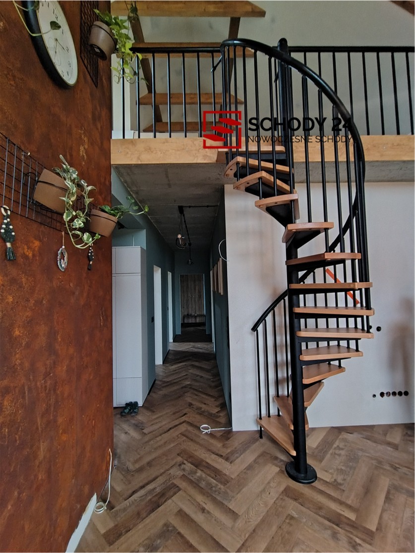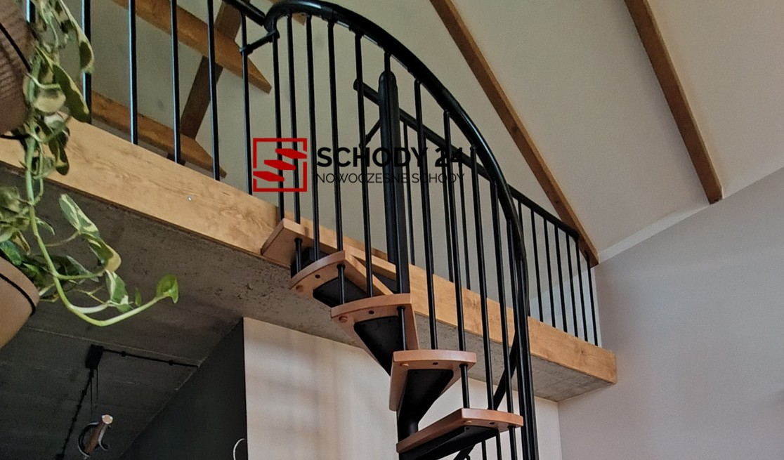 Zestaw schodów spiralnych przystosowanych do średnicy otworu w stropie o wartości 140 cm. Elementy wykonano z litego drewna (kolor do wyboru z palety barw producenta) oraz stali malowanej proszkowo w kolorze czarny mat struktura. Można montować je samodzielnie, lecz producent udostępnia również usługę montażową za dopłatą.