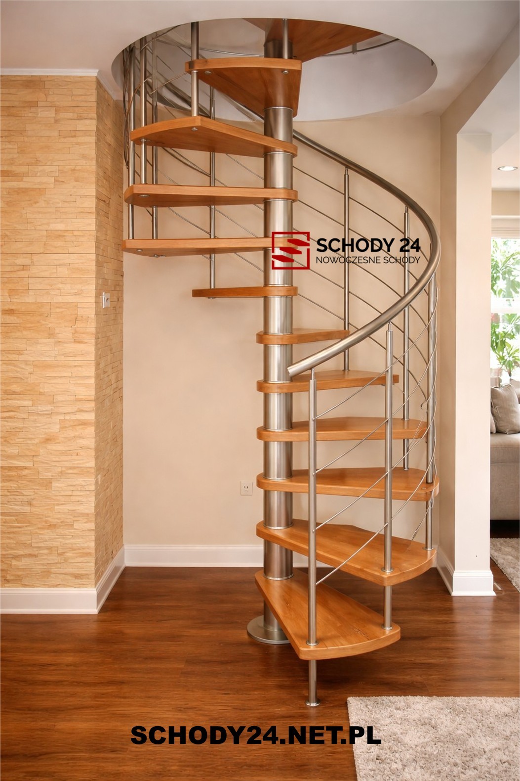 Zestaw schodów spiralnych przystosowanych do średnicy otworu w stropie o wartości 130 cm. Elementy wykonano z litego drewna (kolor do wyboru z palety barw producenta) oraz stali malowanej proszkowo w kolorze satyna stalowy. Można montować je samodzielnie, lecz producent udostępnia również usługę montażową za dopłatą.