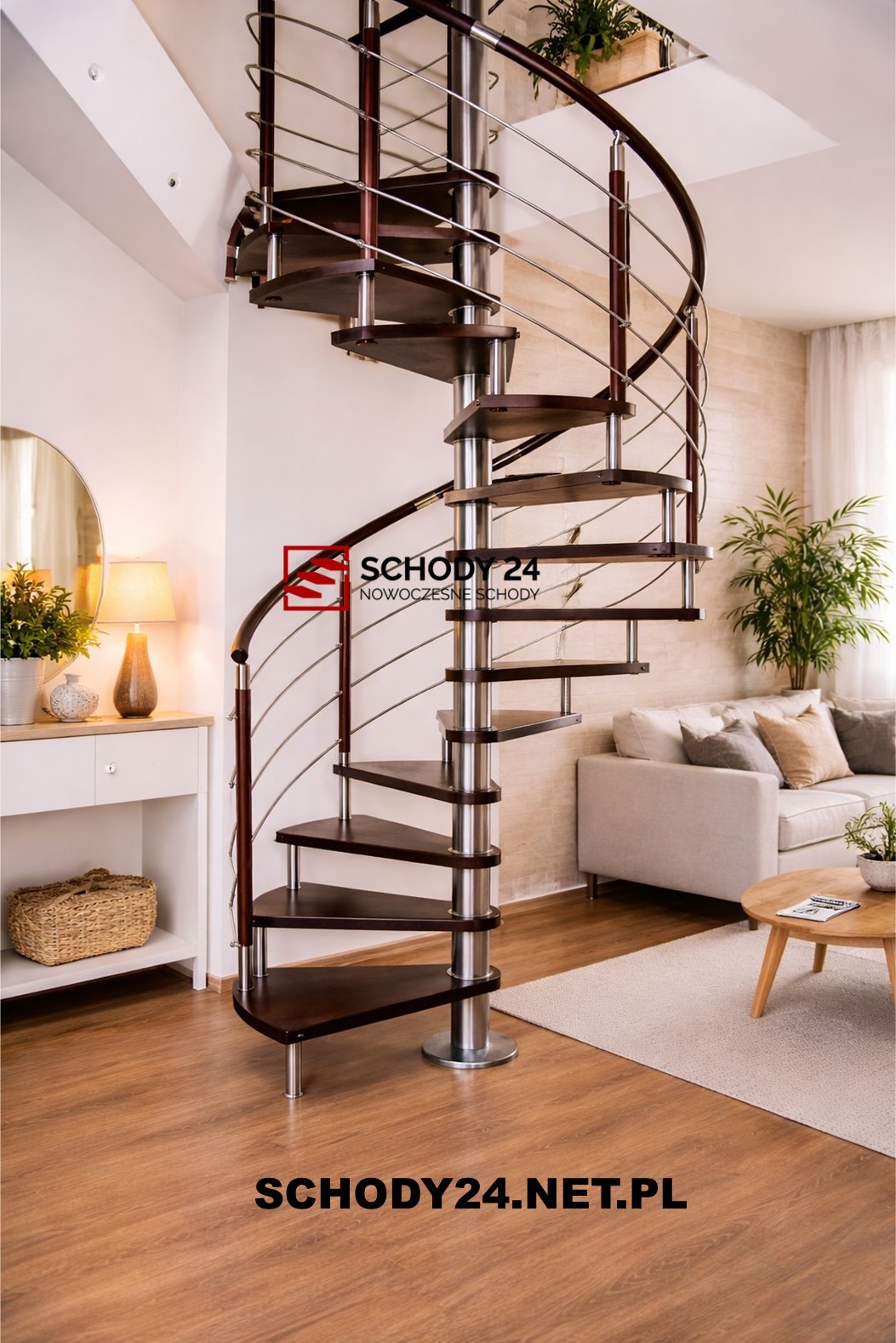 Zestaw schodów spiralnych przystosowanych do średnicy otworu w stropie o wartości 160 cm. Elementy wykonano z litego drewna (kolor do wyboru z palety barw producenta) oraz ze stali nierdzewnej szlif. Można montować je samodzielnie, lecz producent udostępnia również usługę montażową za dopłatą.